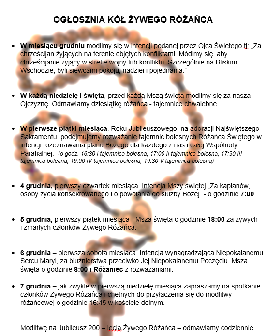 3. Nabożeństwa różańcowe o 17:30. Dzieci zapraszamy w poniedziałki, środy i piątki.